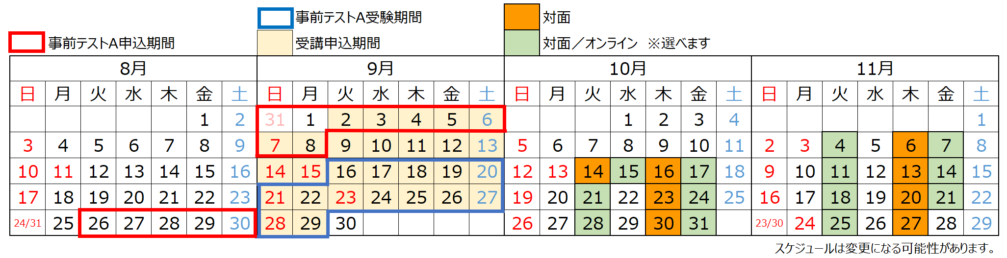 受講申込期限までに受験が可能な事前テストは以下の通りです。