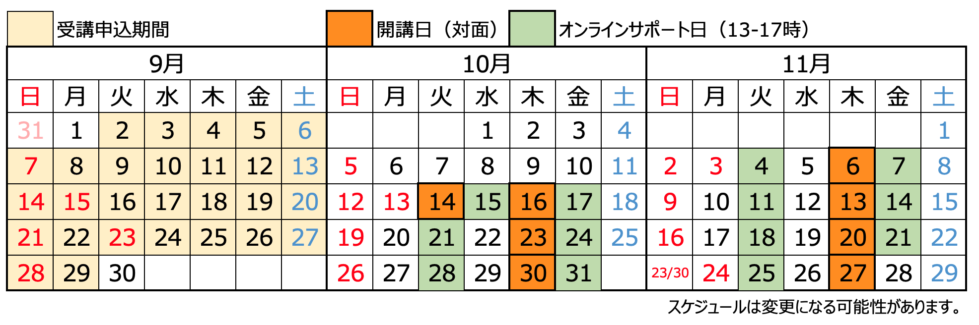 原則対面での実施ですが、オンラインで受講可能な日もあります。